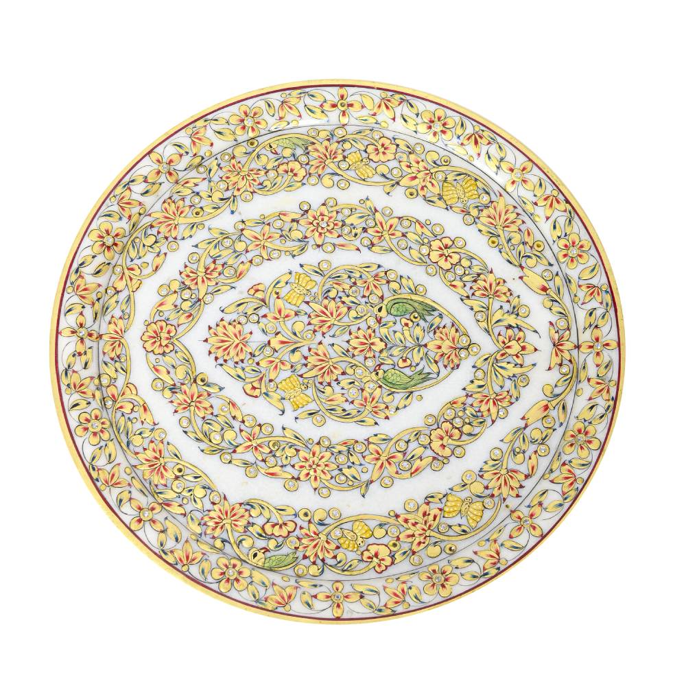 This Decorative marble Plate is also a colorful decor item because of its beautiful Rajasthani Artist work. Made from Marble 24CRTS Gold Hand painting and adorned this figurine has an ornate appeal, which will perfectly suit ethnic home interiors.