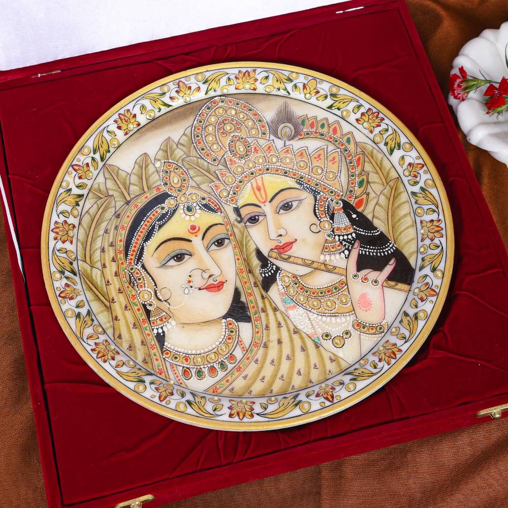 Every Hand made product is unique in its own way it is finely Hand Painted Super fine marble , It is Hand Made and Gold Hand painted Radha Krishna Potrait using emboss work, enamel and beautifies the interiors effortlessly, this Decorative Plate can be a great option for your living room , bedroom, halls, office corners, etc.