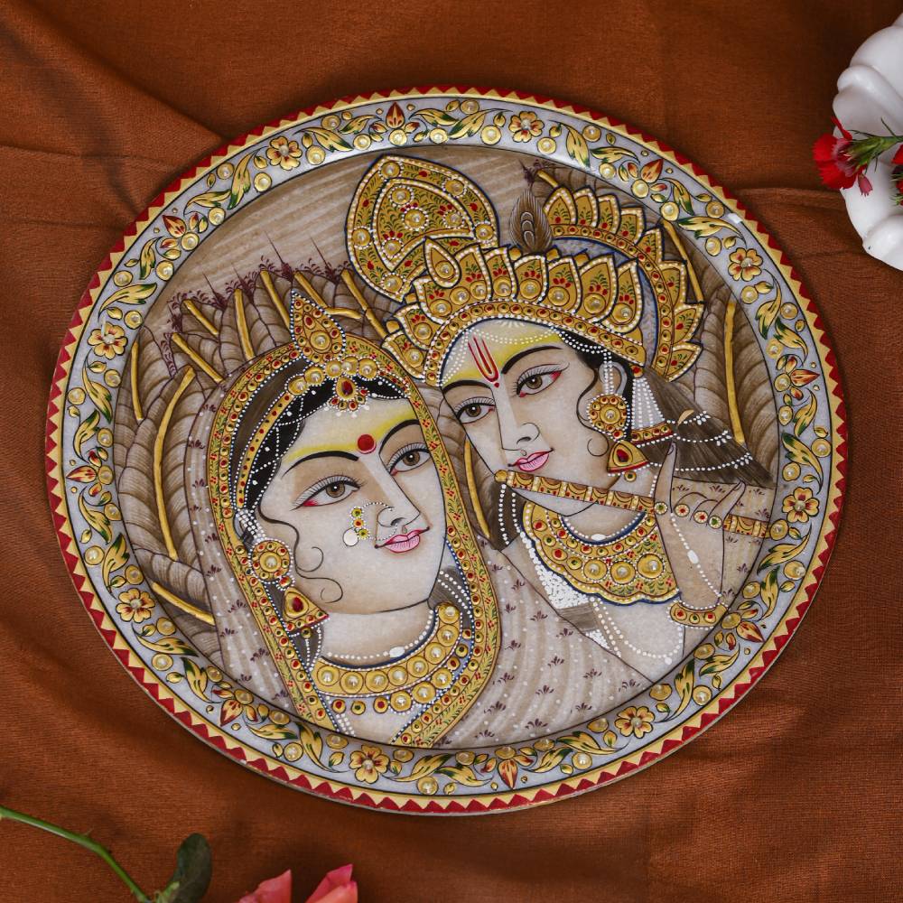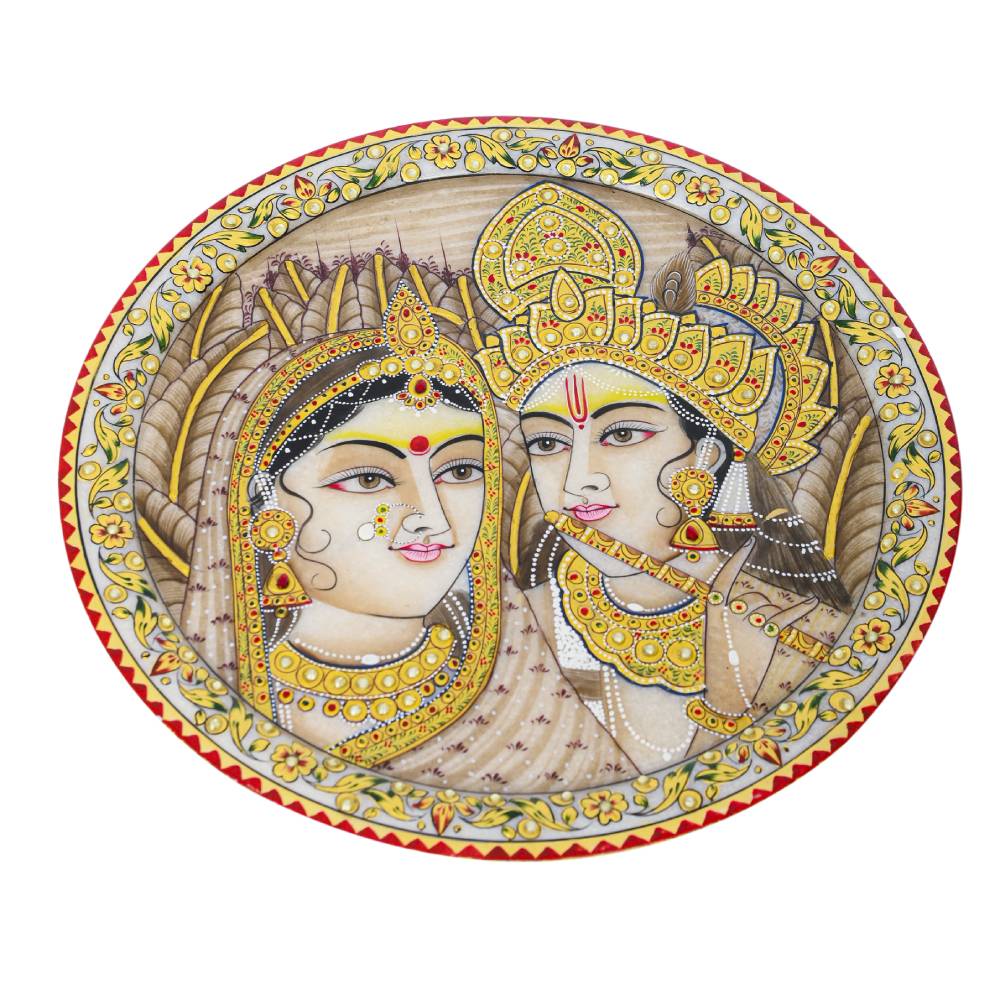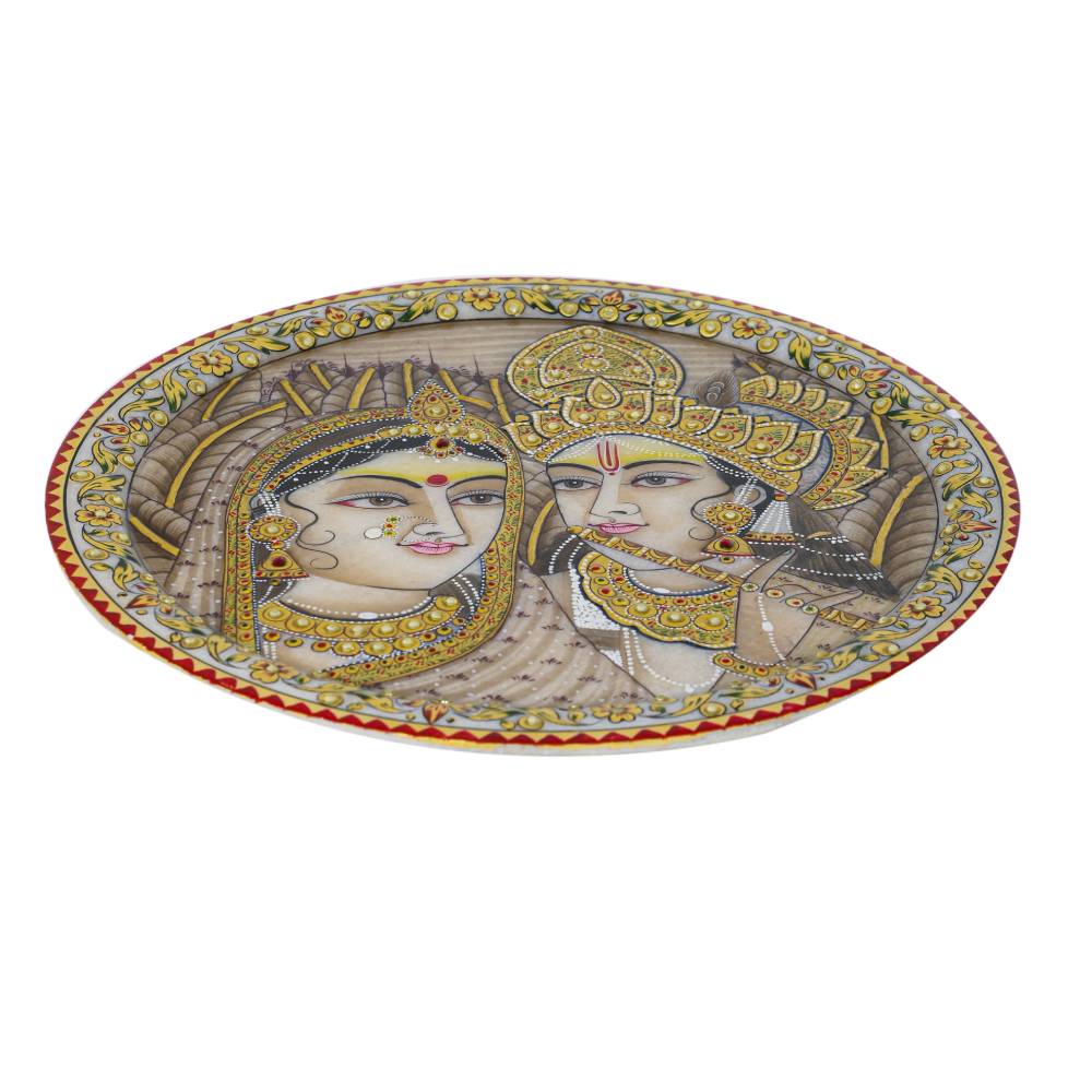 This intricately designed white marble hand painted 24kt Pure Gold paint Radha Krishna Potrait Decorative Plate has been finely handcrafted by artisans of Rajasthan with generations of experience. Bringing you artful pieces and making you smile is our passion.