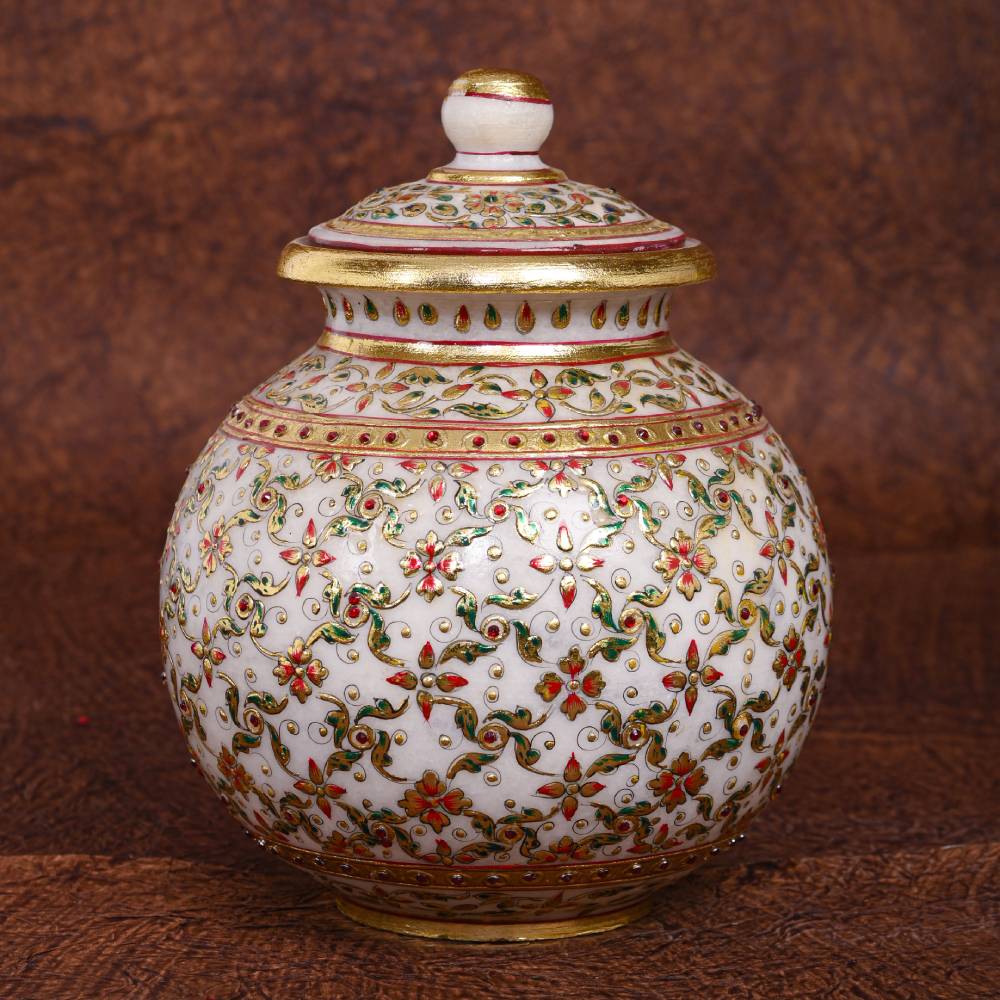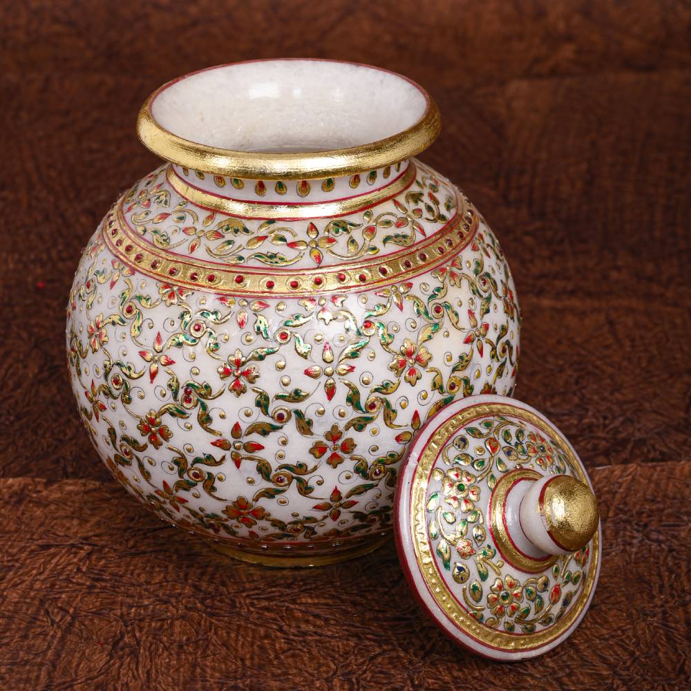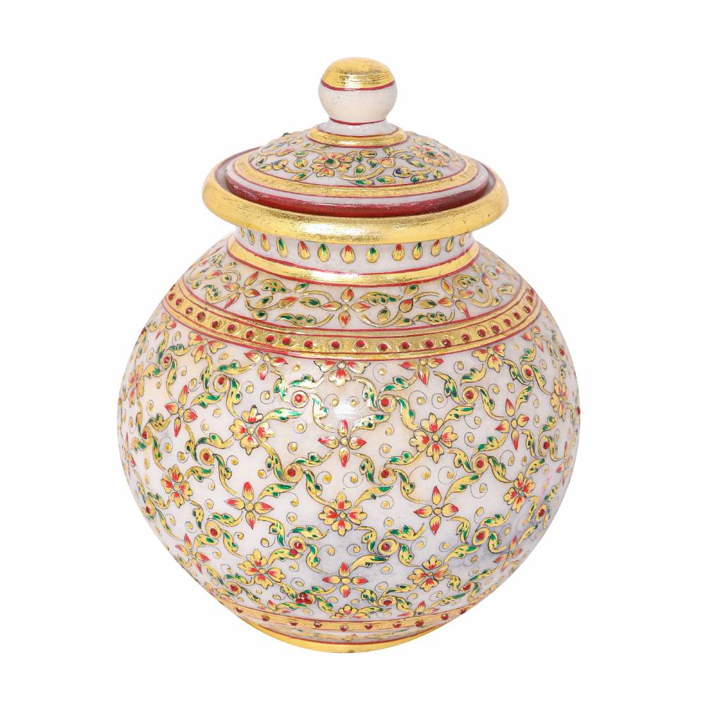 An Expression of Royalty in Indian Kigdoms, this will uplift the purity of your daily Pooja, White Makrana Marble Round Kalash Mughal Meenakari 24CRTS Gold Hand Painted. Home and Office décor.This Kalash represents the finesse and creativity.