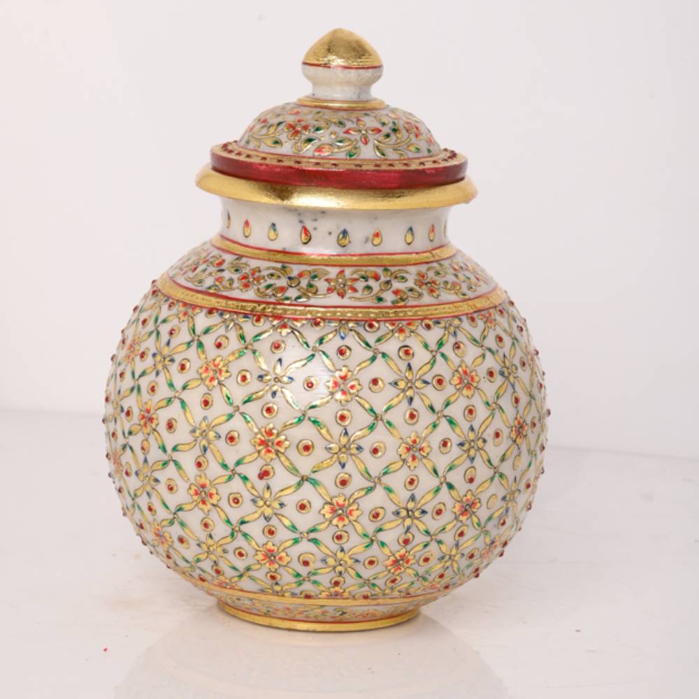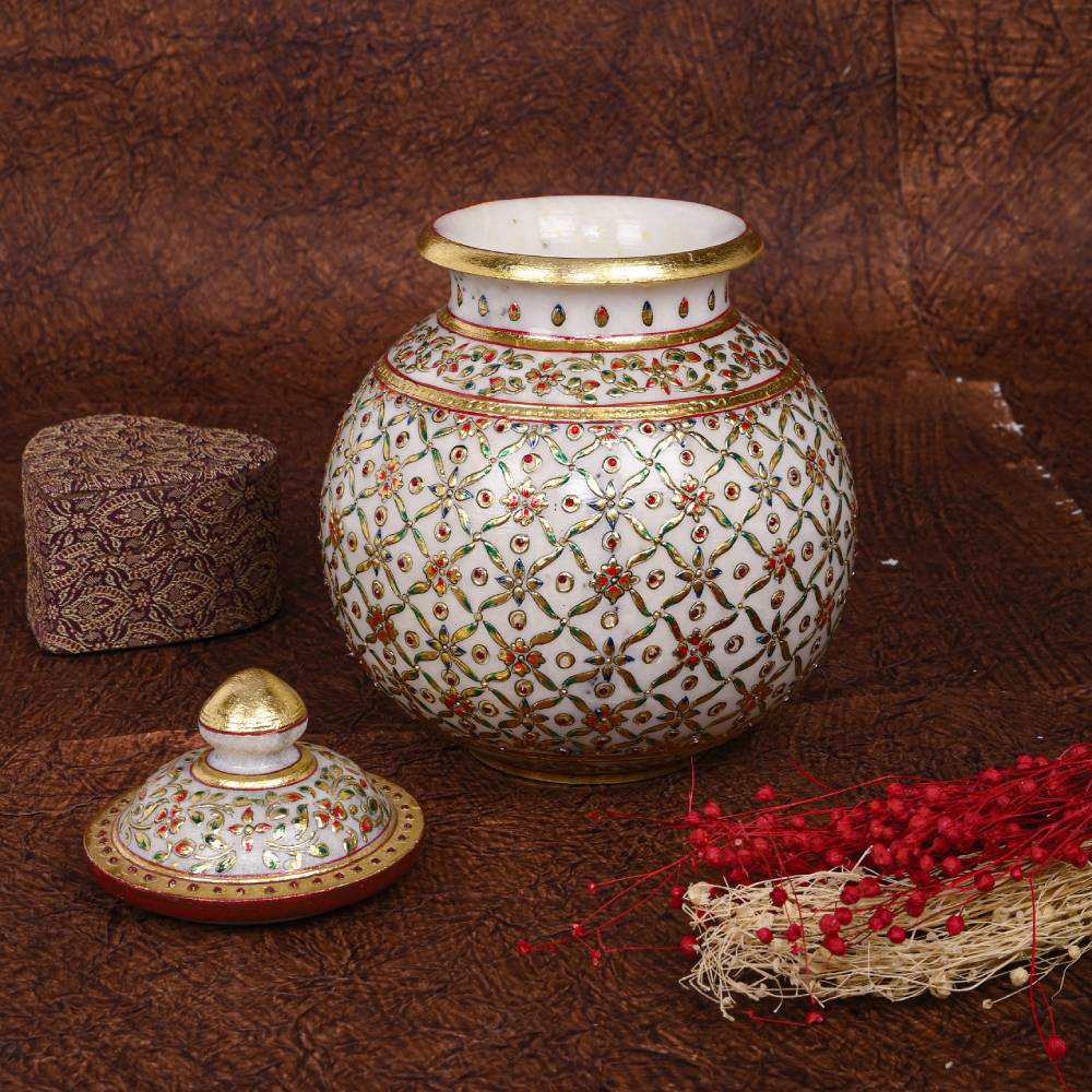 An Expression of Royalty in Indian Kingdoms, this will uplift the purity of your daily Pooja, White Makrana Marble Round Kalash Mughal Meenakari 24CRTS Gold Hand Painted. Home and Office décor. This Kalash represents the finesse and creativity. This Unique Frames can enhance the surroundings of your drawing room or living room. —- Product Highlights. A perfect gift for any occasion. —- Best for gifting, office, home decor. — Hand-painted gold embossed Painting Frame.