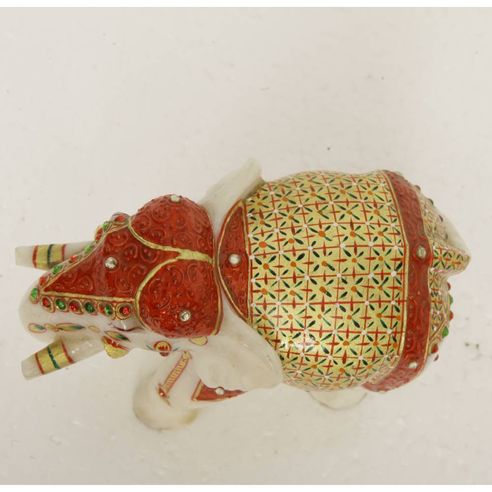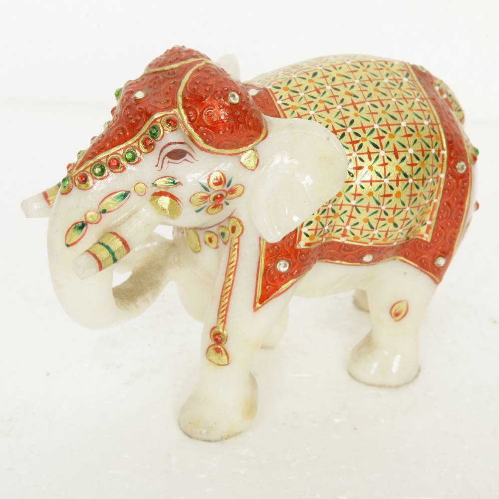 ARTS & CRAFTS WHITE MAKRANA MARBLE MUGHAL ELEPHANT STATUE TRUNK DOWN 24CRT GOLD HAND PAINTED (MULTICOLOUR JHOOL)
