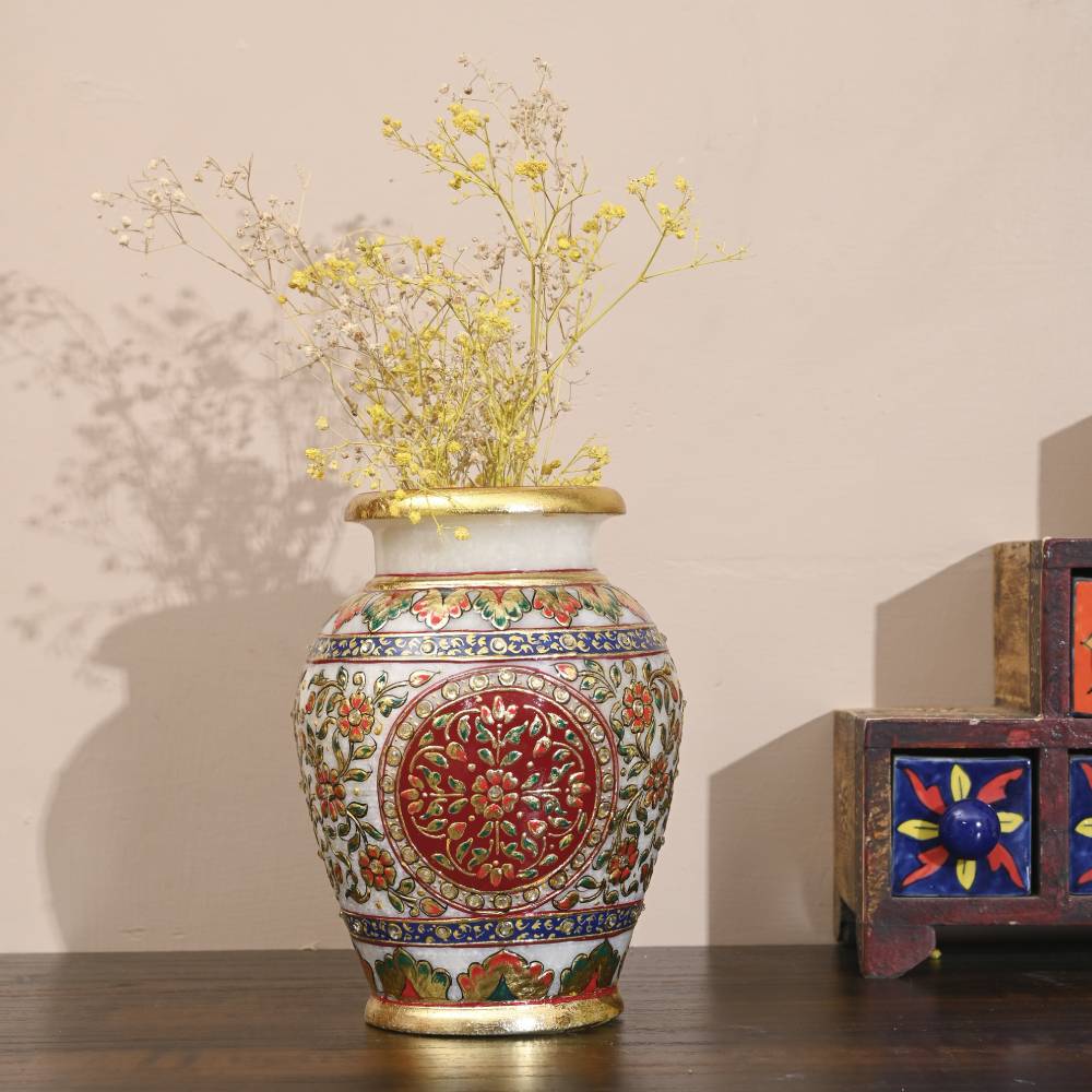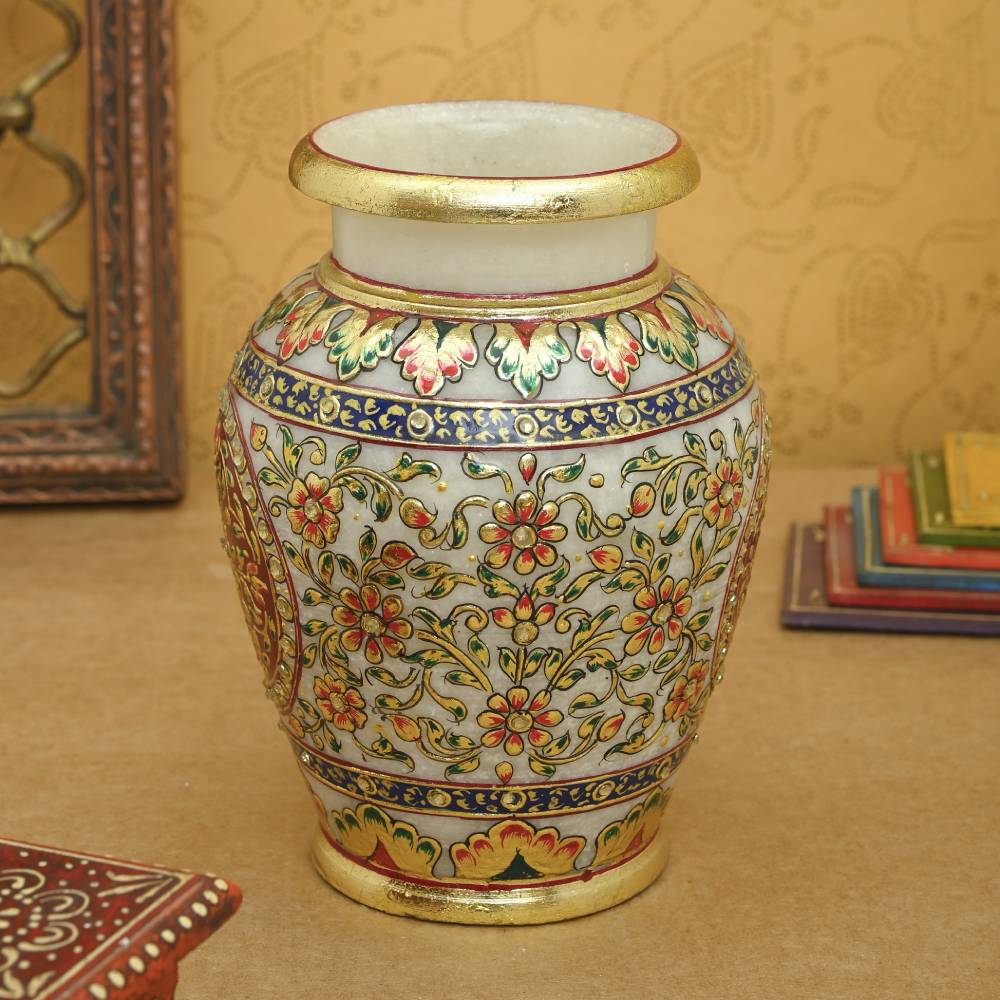 Hand painted gold embossed flower vase. A masterpiece in marble, adorned with subtle stokes of gold work to add brilliance to your home decor. A perfect gift for any occasion. These marvellous handcrafted artifacts from Rajasthan carved out of pure makarana marble (the best marble of India) are the distinguished piece of art to enhance the beauty of your interiors.