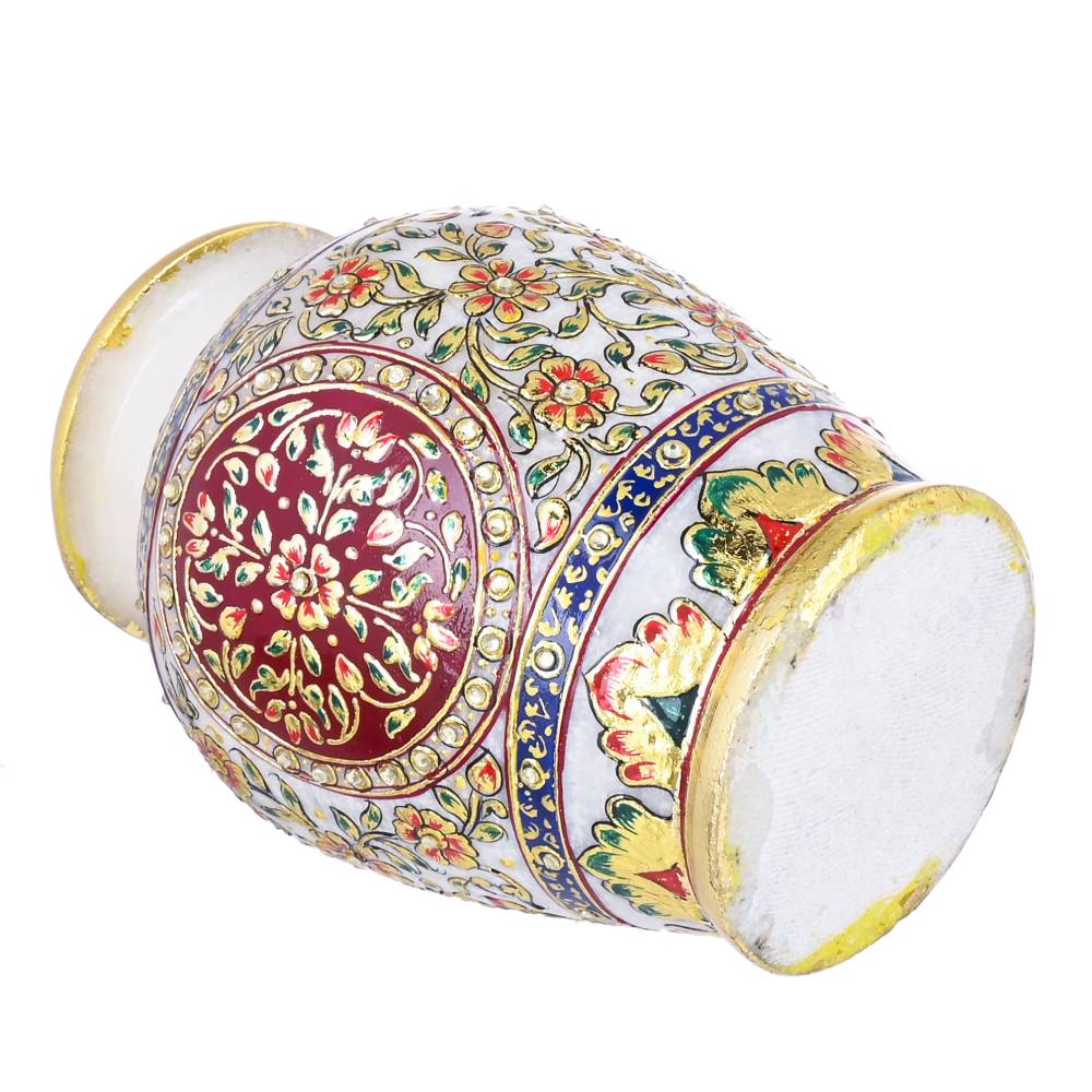 ARTS & CRAFTS WHITE MAKRANA MARBLE LOTA SHAPE VASE MUGHAL DESIGN REAL GOLD HAND PAINTED (MULTICOLOUR)