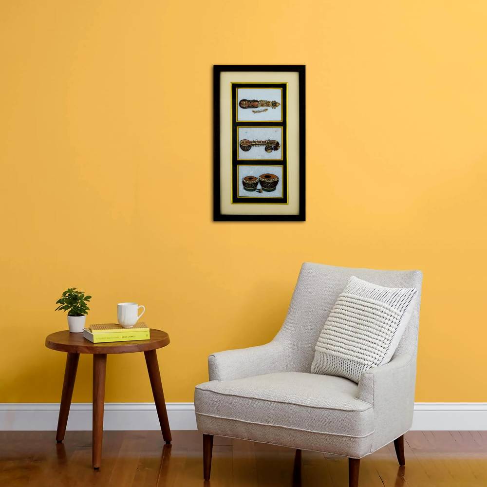 Real Gold Painted Marble Musical Instruments Sitar, Tabla, harmonium 3 Tanjore Painting Frame
