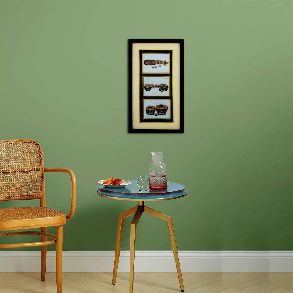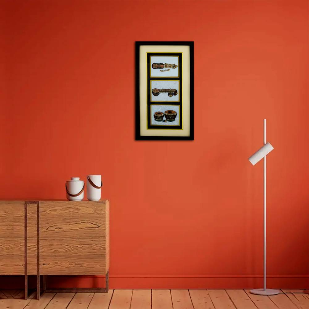 Tags: Artistic Fusion, Classical Elegance, Home Statement Piece, Intricate Detailing, Opulent Decor, Real Gold Painted Marble Musical Instruments, Sitar, Tabla, Tanjore Painting Frame, Veena, White Makrana Marble