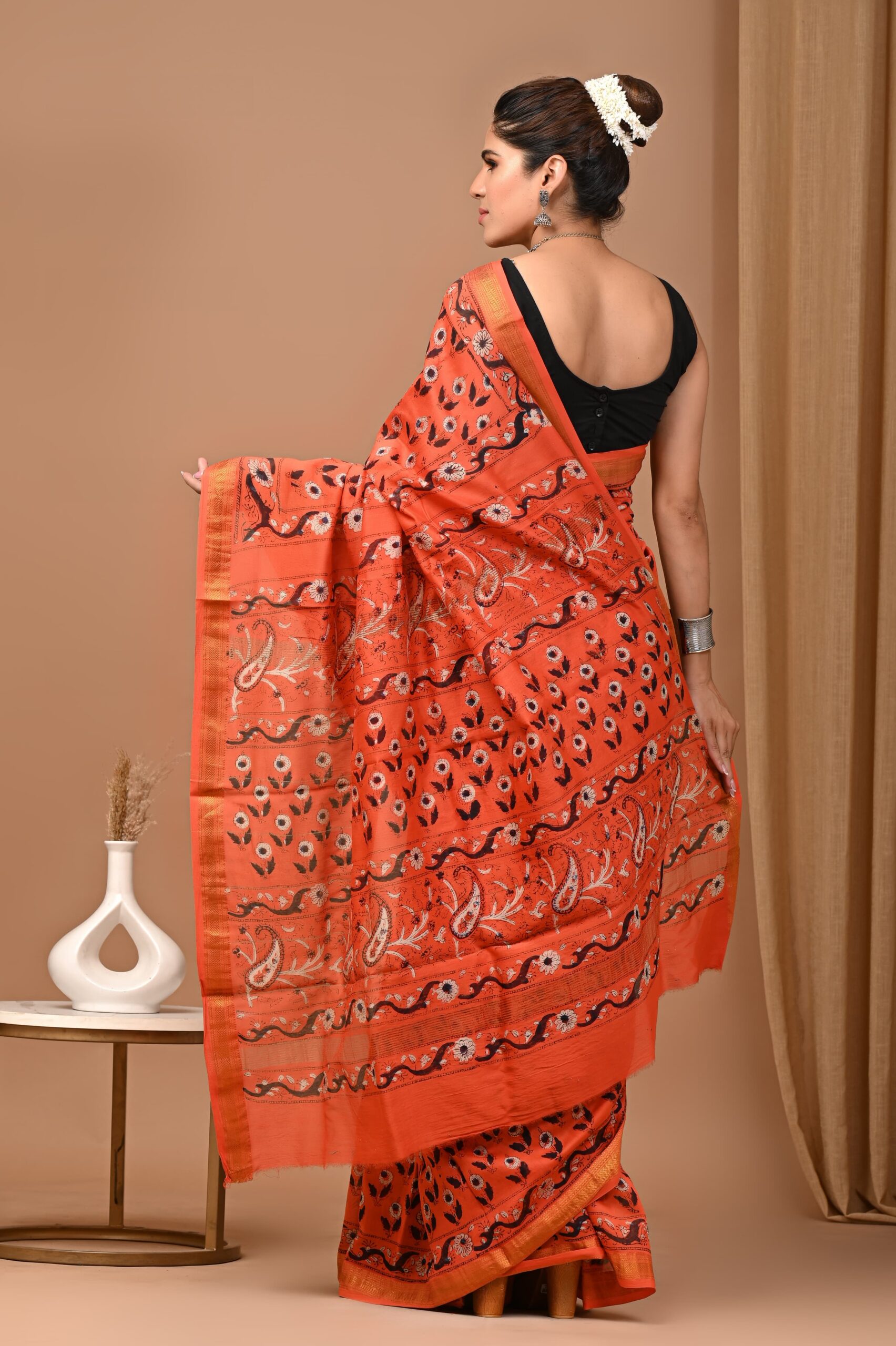 Crafted with exquisite bright red block prints, this saree is the perfect choice for festivals and newly married women. It reflects traditional artistry and meticulous craftsmanship. The rich texture of Maheshwari silk adds a luxurious touch, making it perfect for special occasions. Its unique blend of elegance and comfort ensures you can wear it effortlessly throughout the day.