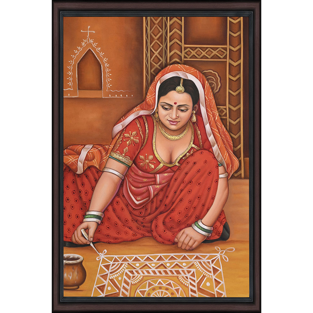 Rajasthani woman making Mandana art on Floor 3'x2'