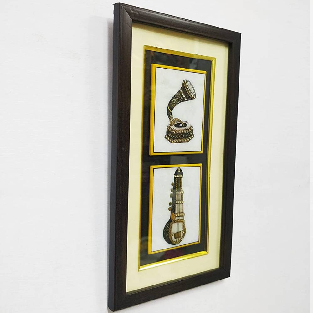 Real Gold Marble Musical Instruments Trumpet and Sitar Tanjore Painting Frame