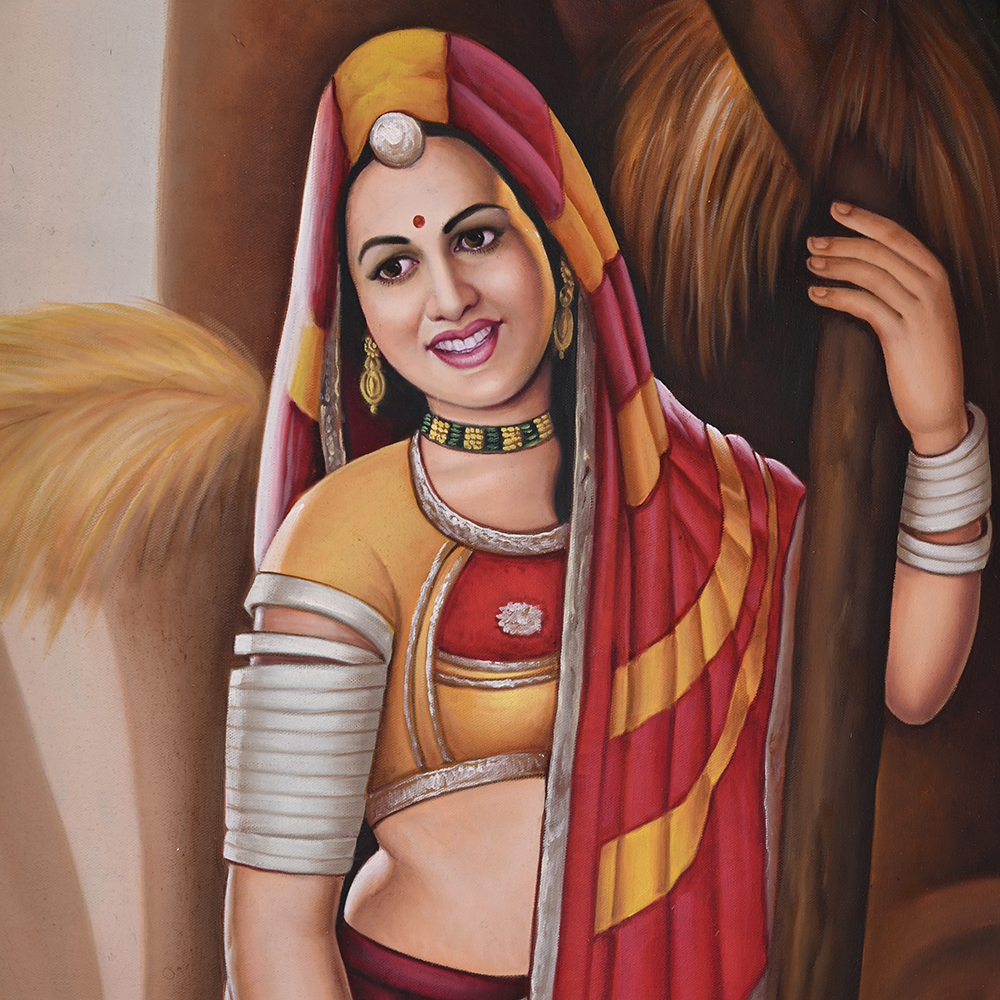 Made with earthen tones this beautiful artwork shows a tribal woman holding a matka smiling with contentness. Hancrafted with oil colors on canvas, this is a true reflection of Indian Tribal beauty.