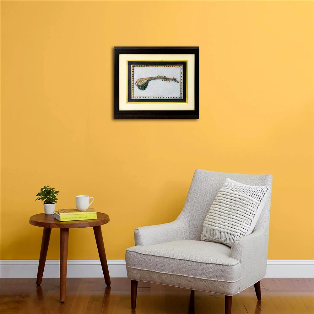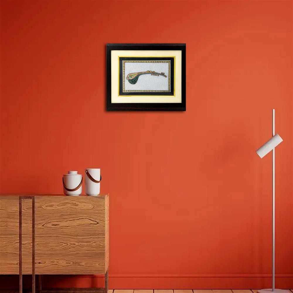 Real Gold Painted Marble Musical Instruments Veena and Tabla 2 Tanjore Painting in Frame